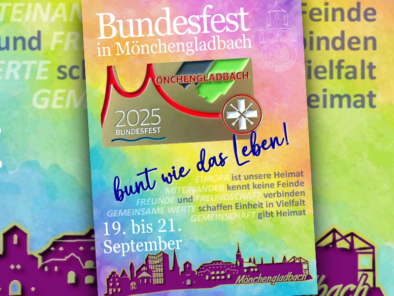Der Bezirksverband Mönchengladbach, Rheydt, Korschenbroich ist vom 19. bis 21. September Gastgeber des Bundesfestes der Historischen Deutschen Schützenbruderschaften und damit für drei Tage Hauptstadt des Schützenwesens – nach 1956, 1972 und 1986 zum vierten Mal. Das Leitwort „Bundesfest 2025 Mönchengladbach – bunt wie das Leben“ orientiert sich am bruderschaftlichen Versprechen, Heimat zu geben und Vielfalt zu feiern: Bezirksbundesmeister Horst Thoren erwartet dazu mehr als 20.000 Schützen, die insbesondere am Festsonntag zum Feiern in die Stadt kommen.